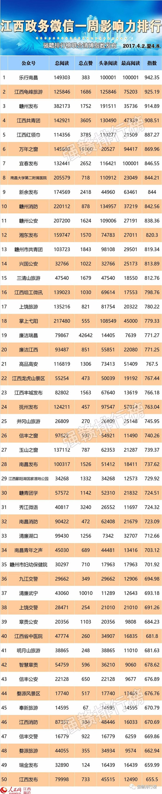 新榜前十名為:樂行南昌、江西龜峰旅游、贛州發(fā)布、江西共青團(tuán)、江西紅領(lǐng)巾、萬年之窗、宜春發(fā)布、南昌大學(xué)第二附屬醫(yī)院、新余發(fā)布、贛州消防。